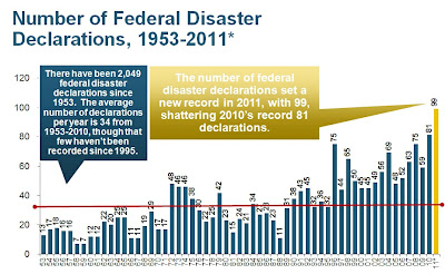 Over the last 25 years it looks like US tornado activity is up, but worldwide hurricane activity is down. Global earthquakes, as we saw above, don't really have a trend. But there has been a definite increase in the number of declared disasters in the US. These have not been caused by an increase in the number of disasters. What we are seeing is the effect of the growth of suburbs and the expansion of expensive coastal properties in hurricane-prone areas of the United States.