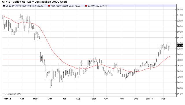 So the major move in the Cotton market was going from $90 a pound on September 20 2010 to $220 a pound by March 7 2011, and then bottoming at $68 a pound on June 4 2012, quite a move there! Since bottoming last June, a major retest was established on November 9 2012 in the $71 a pound area, and since then the market has been putting in higher highs and now stands at $83.19 a pound as of the Friday close in markets.