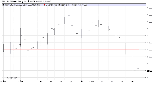 Silver closed Friday`s trading session at $28.46 an ounce, capping off what has been an auspicious start to 2013. On January 23rd Silver was trading at $32 and has been in a downtrend ever since trying to find a support level that will hold.