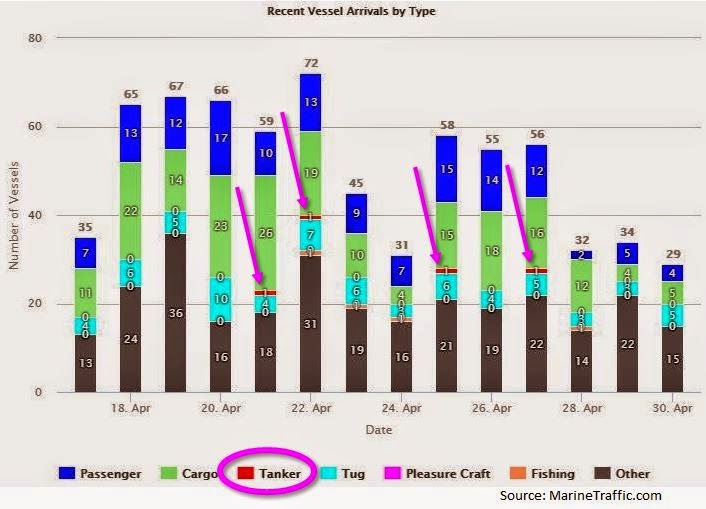 Aside from the vessels hanging out in Rotterdam and Singapore, the busy Port of Fourchon (aka Louisiana Offshore Oil Port ) shows the tanker arrival activity is a ghost town (red bars).