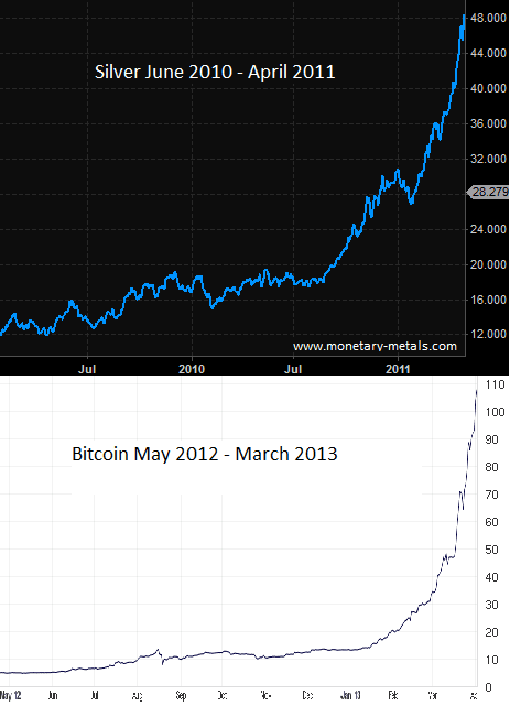 I asked the question: is Bitcoin money? (It's price sure is rising parabolically like silver in 2011) In brief, I said no it’s an irredeemable currency.  This generated some controversy in the Bitcoin community.  I took it for granted that everyone would agree that money had to be a tangible good, but it turns out that requirement is not obvious.  This prompted me to write further about these concepts.