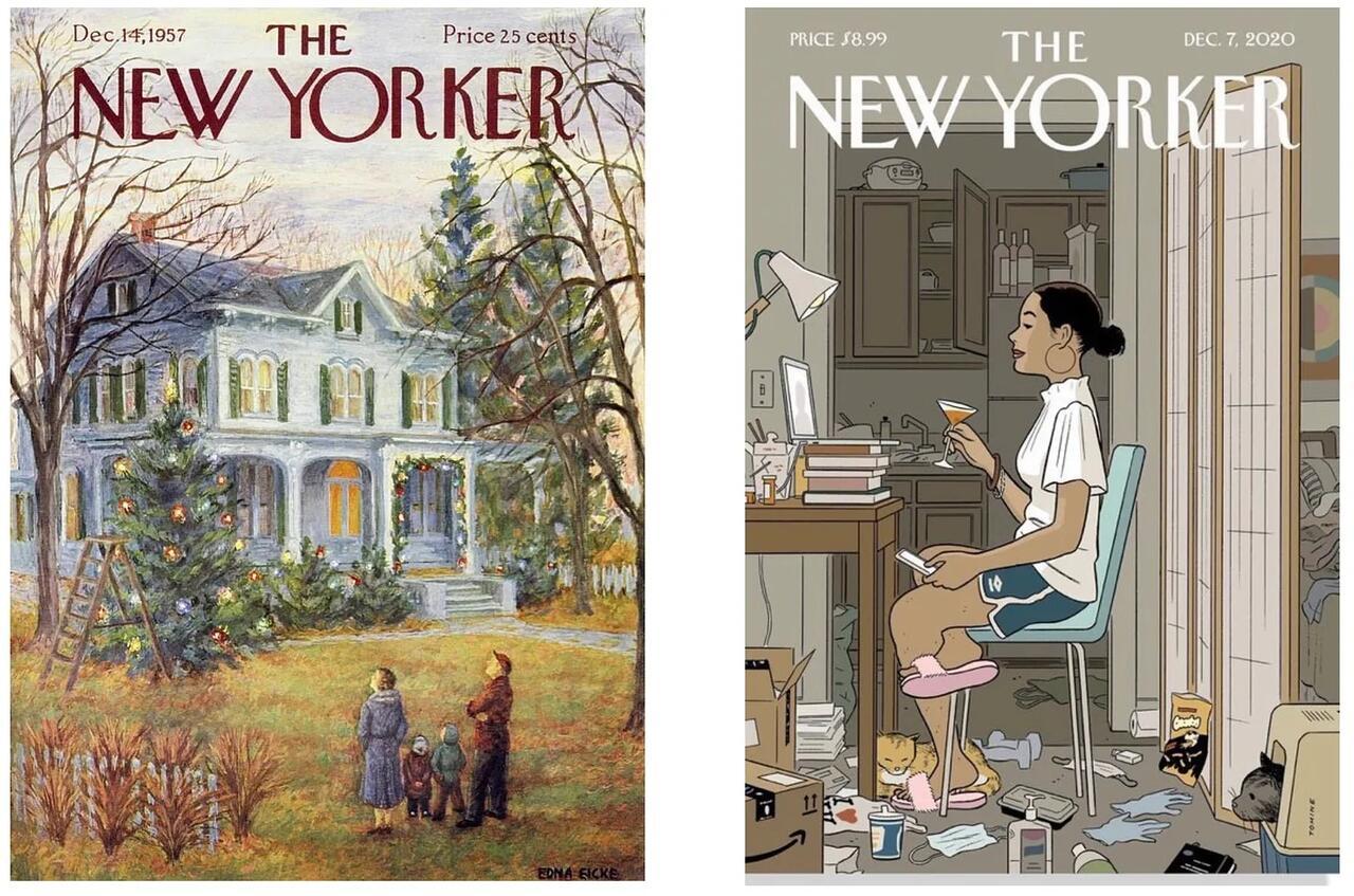 The populace’s rage, therefore, springs from a well far deeper than Green’s economic statistics—or any one else’s, for that matter—could ever fully plumb. Understanding this fury—and its implications for both our civilization and our portfolios—requires returning to an existential question we posed five years ago: how did we devolve from the society depicted in the New Yorker’s 1957 Christmas cover (left) to that depicted in its 2020 Christmas cover (right)?