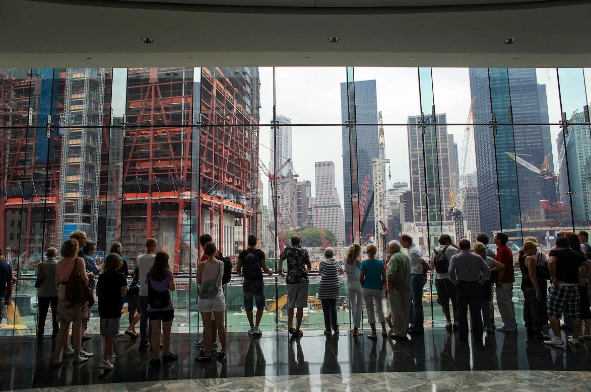 People watch construction at the World Trade Center site in New York City on Aug. 16, 2010. The proposed Manhattan mosque and Islamic cultural center, known as Park51, drew sharp criticism in 2009 over plans to locate it near the site of the Sept. 11 terrorist attacks. Spencer Platt/Getty Images