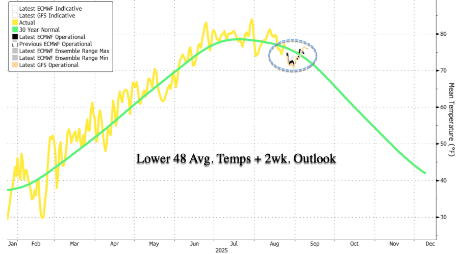 Across the Lower 48, average temperatures are expected to print below the 30-year average through early August.