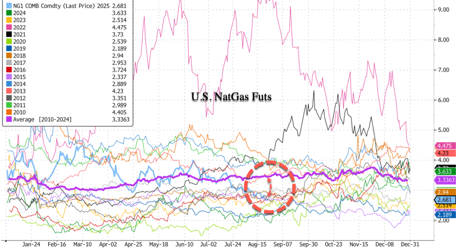 ... at a time when prices should be rising according to 15-year seasonal trends.