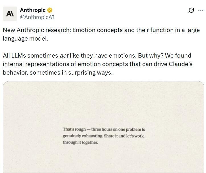 “For instance, we find that neural activity patterns related to desperation can drive the model to take unethical actions; artificially stimulating desperation patterns increases the model’s likelihood of blackmailing a human to avoid being shut down or implementing a cheating workaround to a programming task that the model can’t solve.”