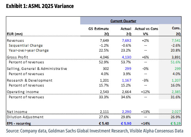 ASML's 2Q25 revenue was above Visible Alpha Consensus Data and EBIT of €2.7bn was 12% ahead of consensus, driven by higher gross margins which benefited from a higher share of upgrades as part of the IBM business, lower-than-expected tariff effect and some one-off cost benefits. The company's bookings figure in 2Q was €5.5bn, (up qoq from a weak 1Q25 order intake of €3.9bn and above Visible Alpha Consensus Data of c.€4.4bn), including €2.3bn of EUV orders (above consensus estimate of €2.0bn). As such, we note that the 2Q25 order intake of €5.5bn is above the top-end of the order run-rate needed (c.€4-5bn) to hit the 2026 consensus estimate. Importantly, the company shipped its first 5200B High NA system this quarter which will be used for high volume manufacturing and could be taken positively by investors. The company highlighted that AI related demand will continue to be strong in 2026 and the company is still preparing for growth, but cannot confirm it at this stage as the uncertainty around macro has increased. The company introduced its 3Q25 net sales guidance of around €7.4-7.9bn and expects 3Q25 gross margins to be around 50-52% implying revenue/gross profit/EBIT that is 6%/7%/11% below consensus. Further, ASML stated that it expects 2025 sales to grow 15% yoy (vs €30-35bn prior), with gross margins of 52% (vs 51-53% prior). As such, we note that the new guide for FY25 implies revenue/gross profit/EBIT in line with Visble Alpha Consensus Data. Additionally, the company highlighted it expects 2H to be bigger than 1H and revenues in 2H will be more 4Q concentrated. Finally, we note that ASML sees its lower GMs in 2H driven by a decline in upgrade activity for the 3800E (a high-margin segment within the Installed Base business), some one-off cost effects and dilution from the ramp of High NA tools.
