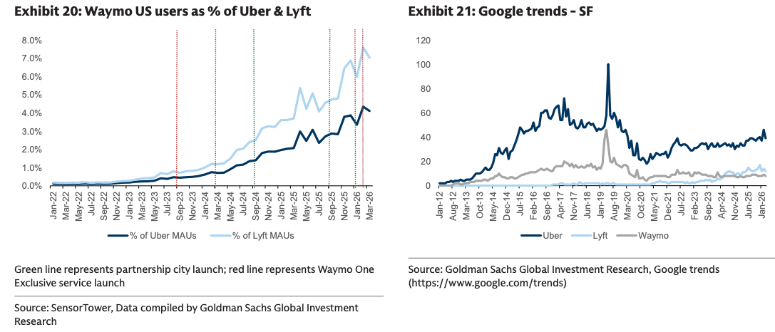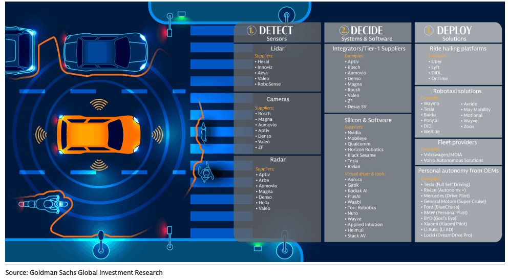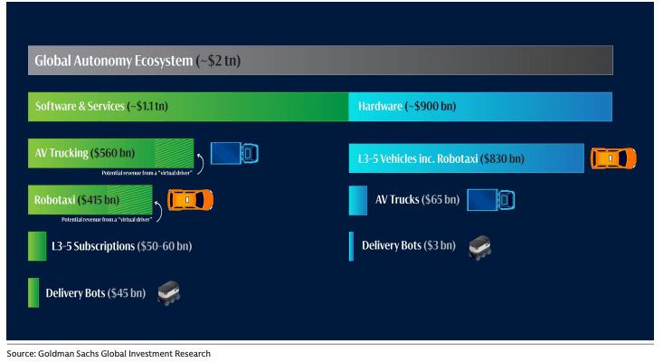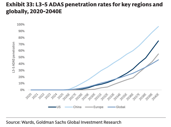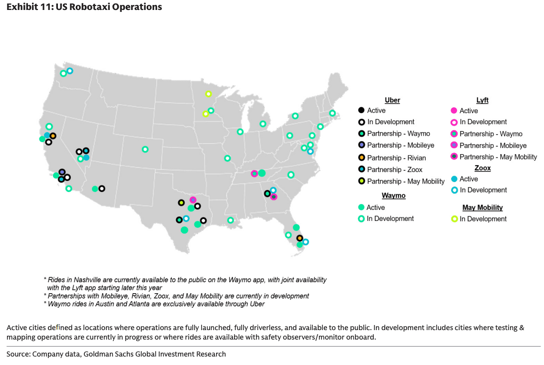 In equities, Goldman highlighted Alphabet, Tesla, Uber, Aurora, Amazon, Pony.ai, Rivian, Mobileye, Lyft, TE Connectivity, Hesai, XPeng, and Volvo Group as beneficiaries of AV deployment.