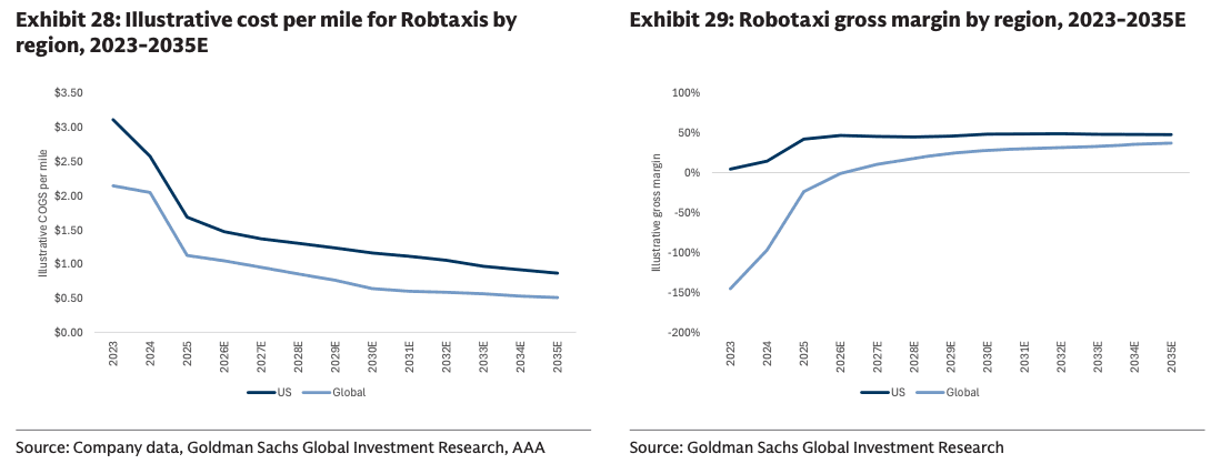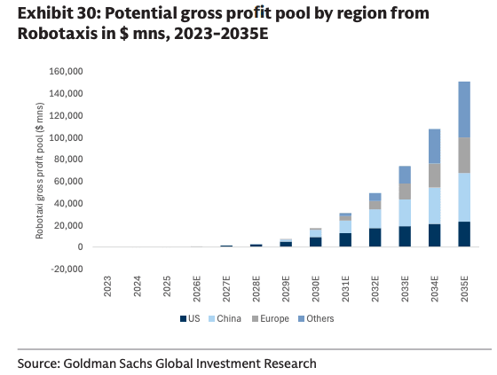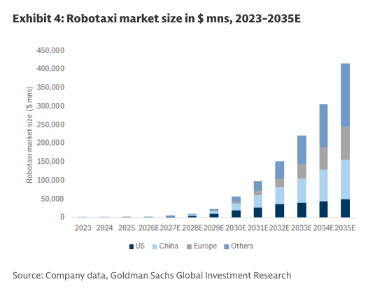 His team expects the global robotaxi market could reach $415 billion by 2035, with vertically integrated operators potentially generating gross margins of 30% to 50% and approximately $150 billion in gross profit by 20235.