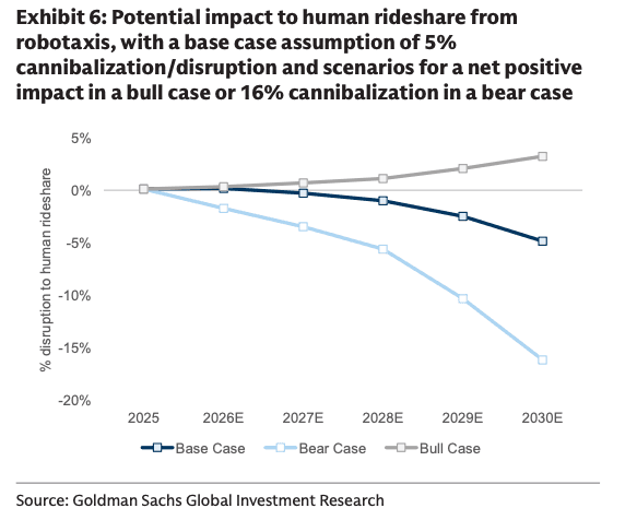 There are already signs of change, with Waymo's share in SF reaching 30%, 20 months after being fully launched (per Yipit), and our base case view is for 5% cannibalization of UCAN rideshare gross bookings from AVs (and 16% in a bear case) by 2030.