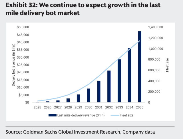 The proliferation of AVs will not just be limited to robotaxis. Delaney expects the last-mile delivery bot market to explode in the early 2030s.