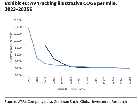 AV trucking costs per mile are set to collapse by the end of the decade and remain range-bound around the $2-per-mile mark by the midpoint of the next decade.
