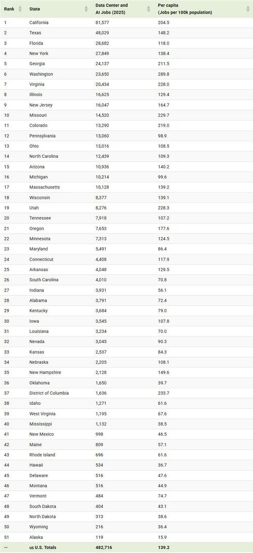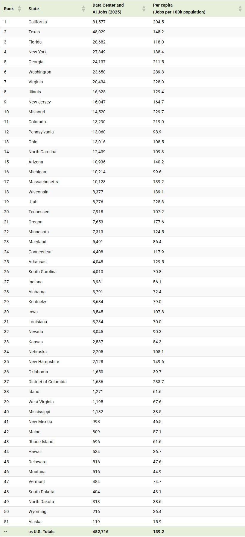 California leads the nation with 81,577 AI and data center jobs, accounting for about 17% of the U.S. total.