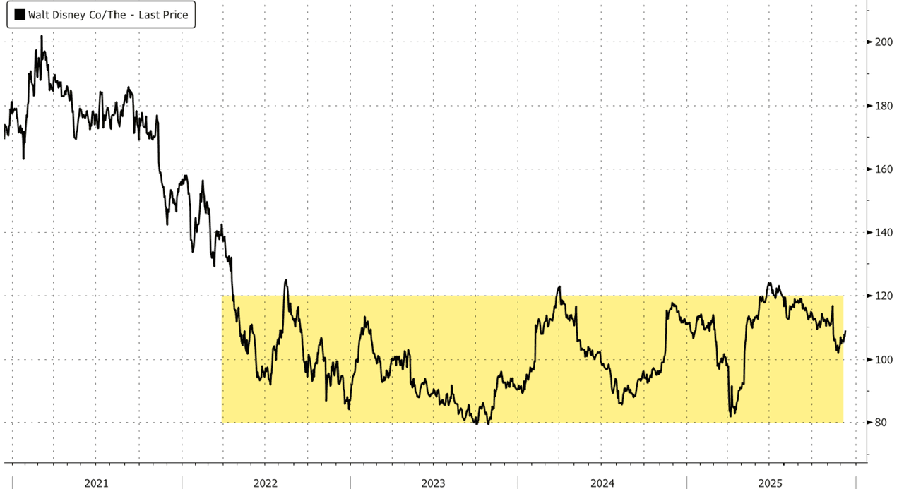 Disney shares are up 2% in early trading. Year-to-date, the stock is down 2% and has been trading sideways since its peak in early 2021.