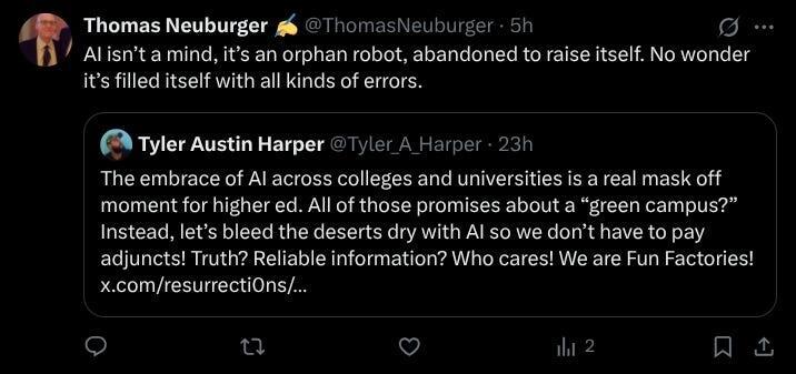 Arnaud Bertrand has the best explanation of what AI is at its core. It’s not a thinking machine, and its output’s not thought. It’s actually the opposite of thought — it’s what you get from a Freshman who hasn’t studied, but learned a few words instead and is using them to sound smart. If the student succeeds, you don’t call it thought, just a good emulation.