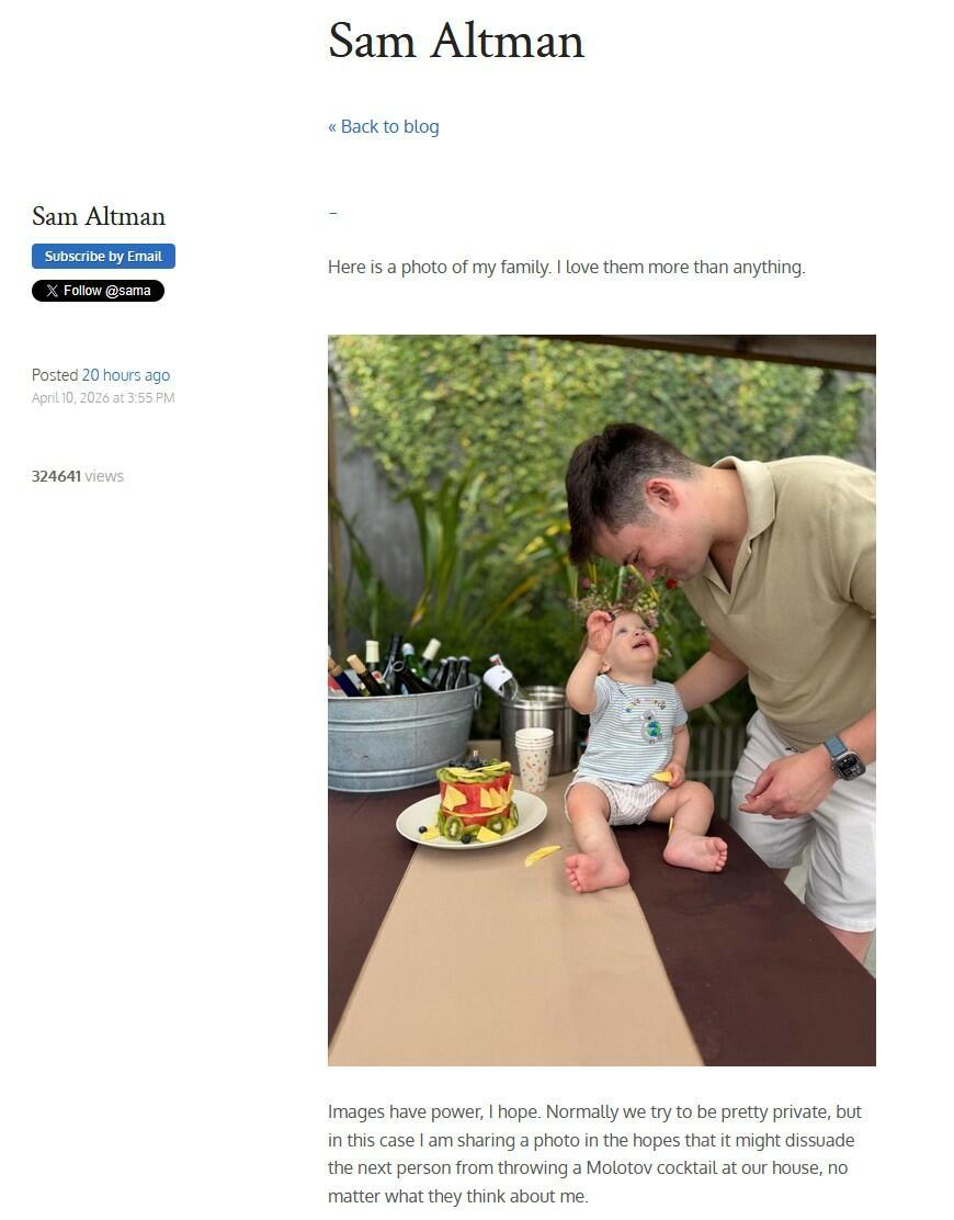 Hours later, Altman published a strikingly personal blog post that has generated almost as much discussion as the attack itself. Read Altman’s full post here. In it, he shared a rare family photo with his husband Oliver Mulherin and their child, writing: “Here is a photo of my family. I love them more than anything. Images have power, I hope… Normally we try to be pretty private, but in this case I am sharing a photo in the hopes that it might dissuade the next person from throwing a Molotov cocktail at our house.”