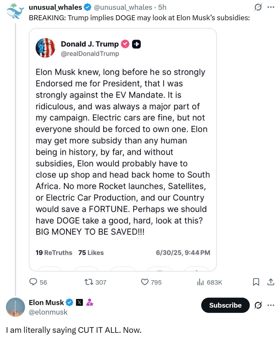 “No more Rocket launches, Satellites, or Electric Car Production, and our Country would save a FORTUNE. Perhaps we should have DOGE take a good, hard, look at this? BIG MONEY TO BE SAVED!!!” Trump wrote.