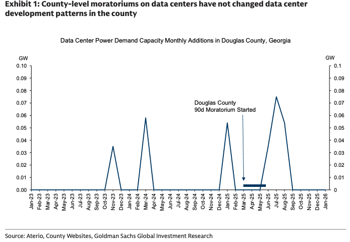 - We take Georgia as an example, where we estimate the power market is not tightening and power price increases were below the national average in 2025. There was wave of moratoriums enacted by at least six counties in the past year, putting a pause on new data centers for at least a few months (for example, in Coweta and DeKalb counties). However, most of these counties have no existing data centers, only proposed projects to start in a few years, so we do not expect these moratoriums to impact data center developments in the near future. Going forward, with no clustering advantage within these counties (to stay close to another data center with established data highways), we believe even permanent bans would only result in project relocation to a more welcoming area (potentially the neighboring county) rather than cancellations