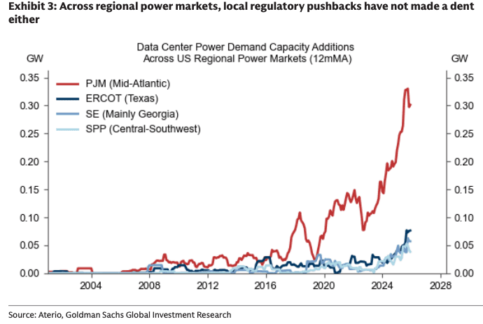 However, Goldman analysts led by Hongcen Wei have some disappointing news for residents in the Mid-Atlantic, and frankly elsewhere, who are trying to slow data center development: "U.S. Local Regulatory Pushbacks Against Data Centers Are Not Slowing Development."