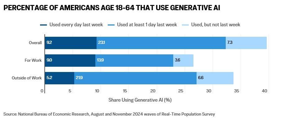 Generative AI is being rapidly adopted by Americans, even outpacing the spread of personal computers or the internet, according to a study by the National Bureau of Economic Research. By late 2024, nearly 40 percent of Americans ages 18 to 64 were using generative AI, the study found.