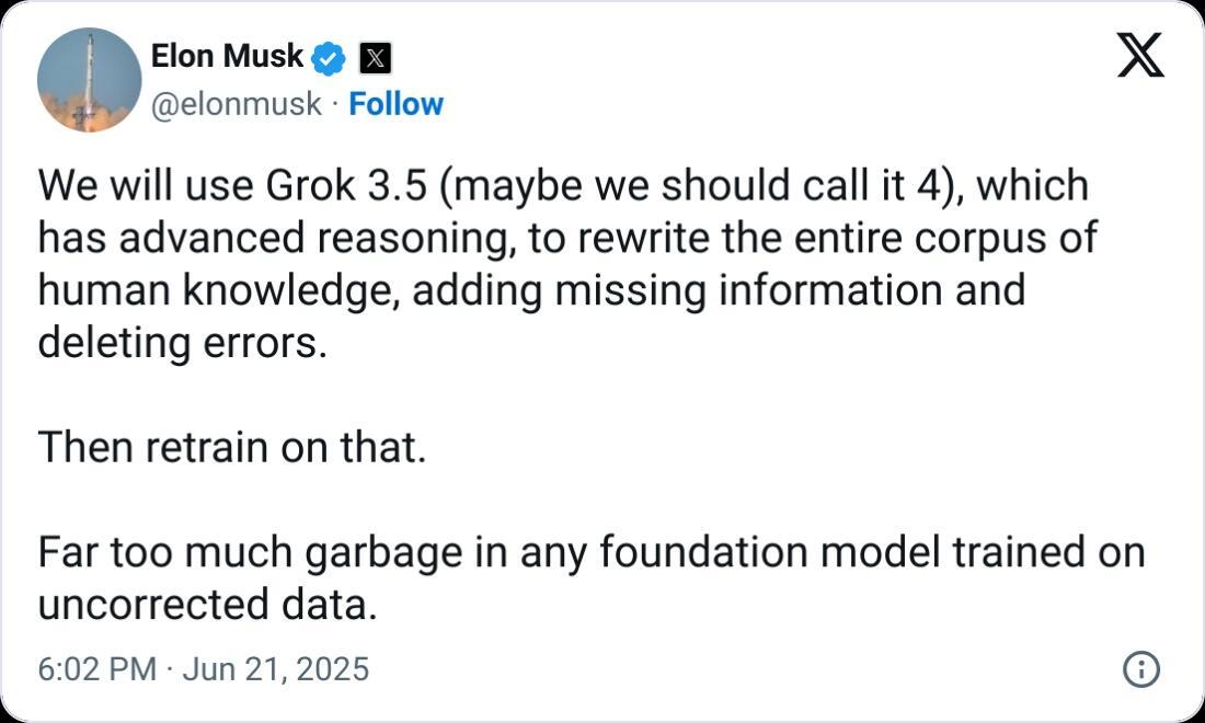 He said the model would then retrain on the new knowledge set, claiming there was “far too much garbage in any foundation model trained on uncorrected data.”
