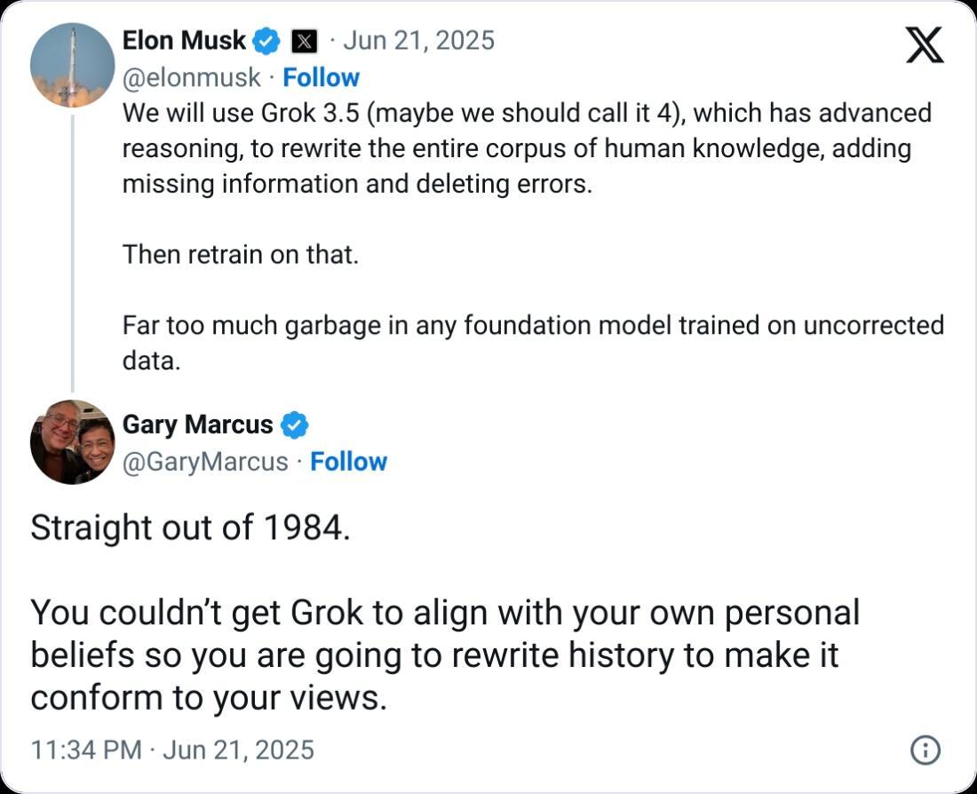 “Straight out of 1984,” Marcus wrote on X. ”You couldn’t get Grok to align with your own personal beliefs so you are going to rewrite history to make it conform to your views.”