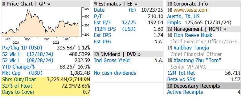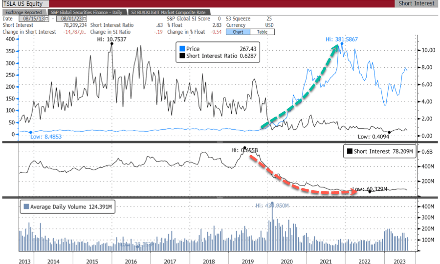 According to the latest Bloomberg data, the short position on Tesla is around 2.65% of the float short, or about 72 million shares, with about .7 days to cover.