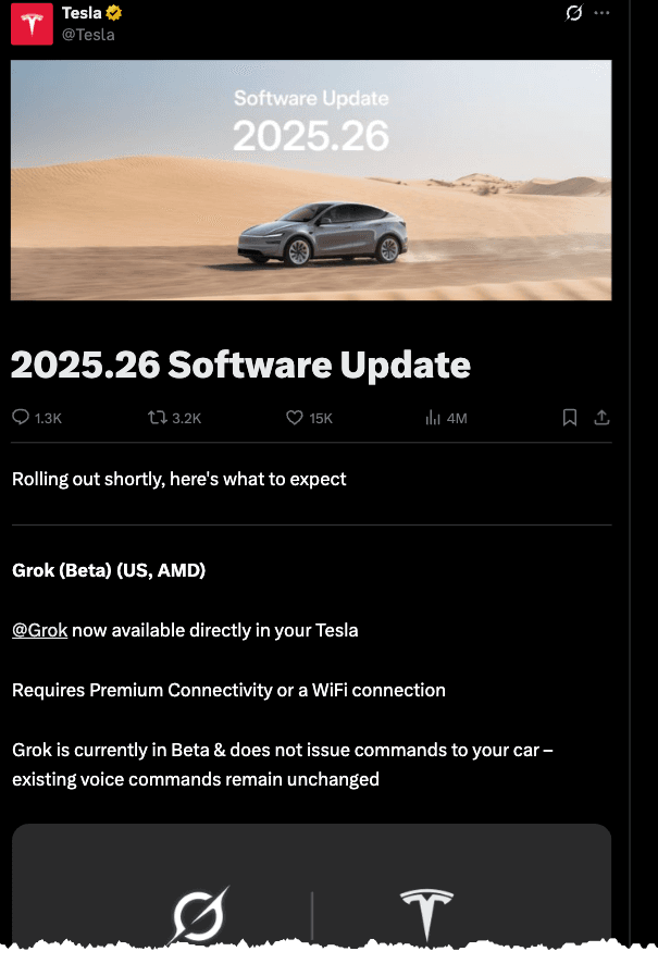 "Grok (Beta) (US, AMD) @Grok now available directly in your Tesla. Requires Premium Connectivity or a WiFi connection. Grok is currently in Beta & does not issue commands to your car – existing voice commands remain unchanged," Tesla wrote in a blog post on X last week.