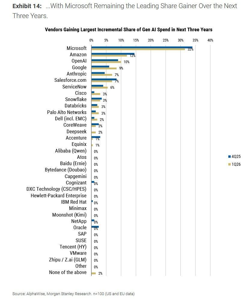 However, fresh data from Morgan Stanley’s 1Q26 CIO Survey (fielded February 3–March 10 among 100 US and European CIOs - available to pro subs here) offers some early empirical support for the enterprise pivot - while also highlighting just how steep the climb is. Artificial Intelligence/Machine Learning has cemented its position as the clear #1 CIO priority (17.7% of respondents named it a top-three area, up from 16.3% in 4Q25), with 39% now calling it their single highest priority. Yet when CIOs were asked which vendors are poised to capture the largest incremental share of GenAI spending, Microsoft dominated both the one-year and three-year outlooks by a wide margin. OpenAI still ranked solidly inside the top tier - behind Microsoft, Amazon, Google, Salesforce and ServiceNow - and was also cited as a preferred vendor for building custom AI applications today and three years out.