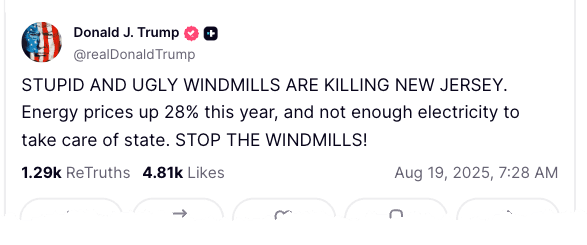 "STUPID AND UGLY WINDMILLS ARE KILLING NEW JERSEY," President Trump wrote on Truth Social moments ago.