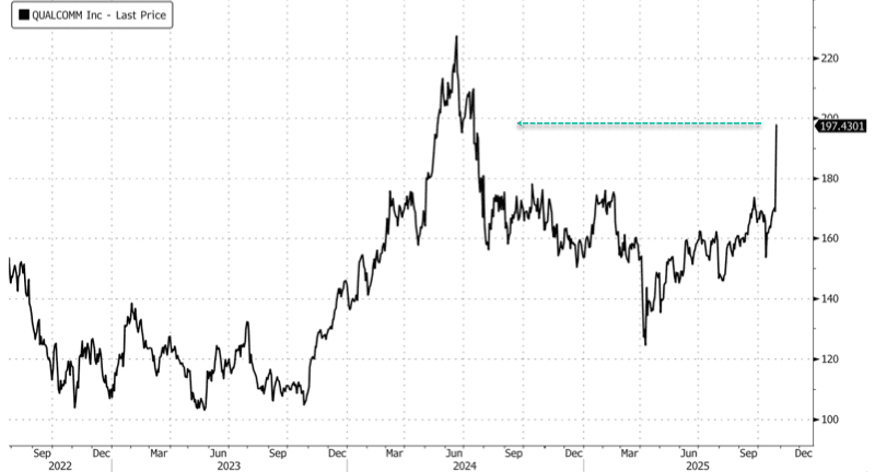 Qualcomm shares jumped the most in years on Monday morning in New York following the major unveiling of next-generation data center chips aimed at challenging Nvidia's control of the AI data center chip market.