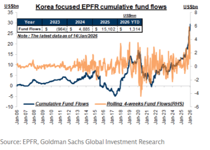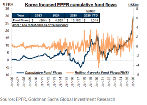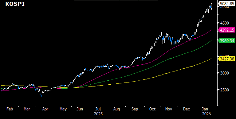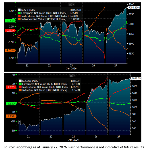 - Optimism is building ahead of the heavy earnings season, with January 29th being a key date for Samsung Electronics (005930, +5%) and SK Hynix (000660, +9%) earnings reports. GIR recently raised its KOSPI target to 5,700 (from 5,000), driven by earnings upgrades rather than P/E multiple expansion.