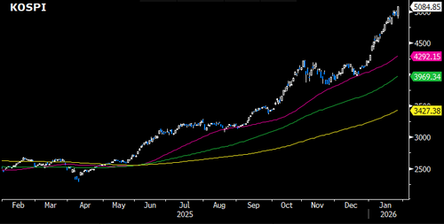 More broadly, KOSPI made a "clear breakout above 5,000 and closed @ 5,085 today, marking YTD growth of +21%," Goldman analyst Heather Oh told clients earlier.