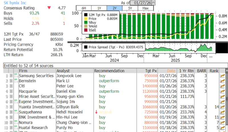 According to Bloomberg data, Wall Street analysts rate SK Hynix with 41 buys, 2 holds, and just 1 sell.