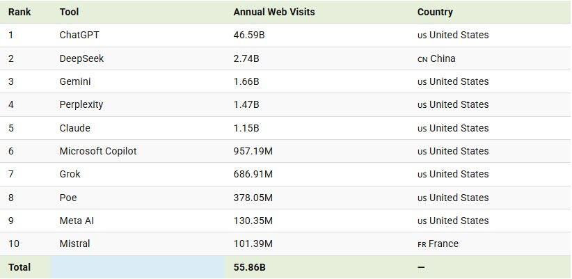 DeepSeek emerged as the second most-used chatbot, tallying 2.74 billion visits—a huge 48,848% increase from last year. Gemini and Claude follow with 1.66B and 1.15B visits respectively, posting strong growth rates. Still, none come close to ChatGPT’s reach.