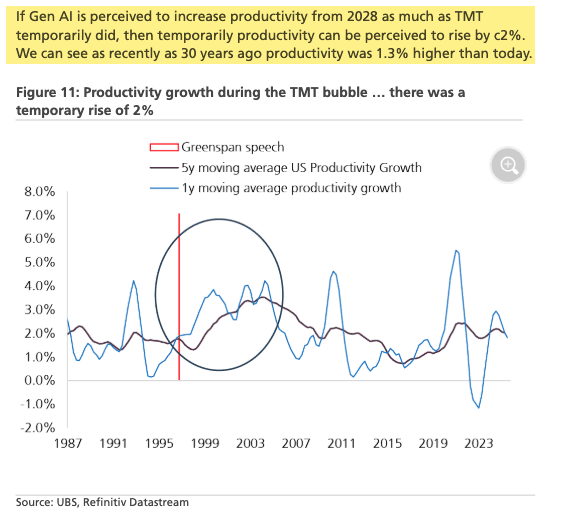 UBS analyst Andrew Garthwaite wrote that his bullish target for the MSCI AC World is 1,090 by end-2026 (+11%). But he noted that if GenAI delivers even half the productivity surge that late-1990s Tech was believed to produce, the S&P 500 could "easily" justify 7,000.