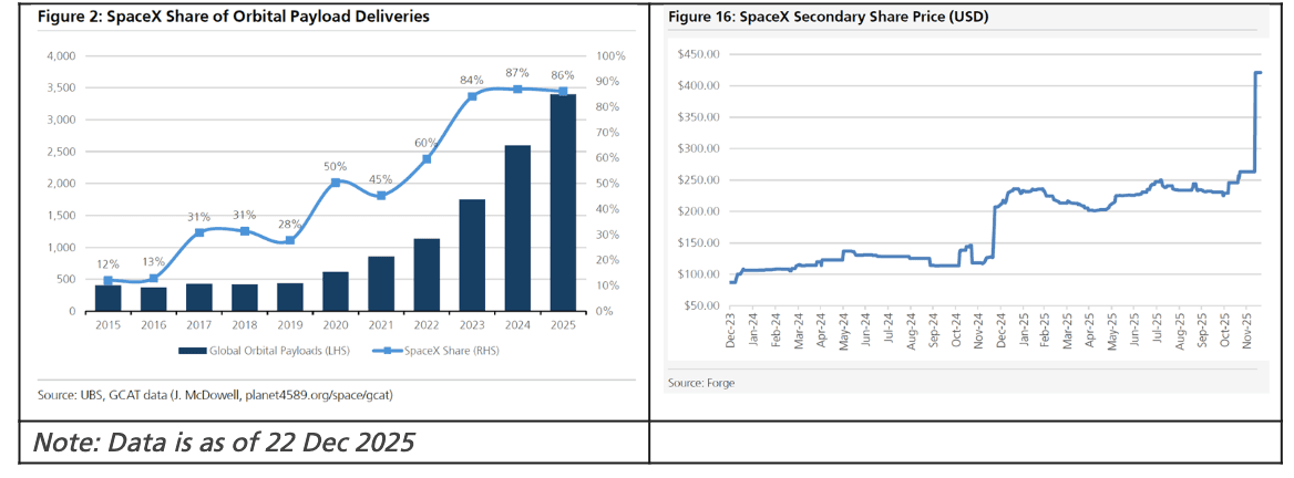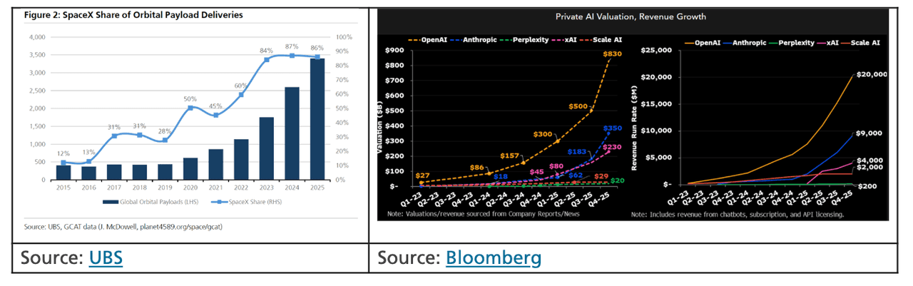 Spaced Out: SpaceX's merger with xAI broke this week — just as SpaceX has become the undisputed heavyweight of the orbital payload market. The company is now so dominant it effectively is the global launch cadence (see UBS's John Hodulik chart below, report here). But pulling xAI into the fold adds a new twist. What had been a clean space‑infrastructure story now becomes a space × AI narrative, pairing orbital payload dominance with an AI business burning nearly $1B a month. The question for investors is whether this move expands the opportunity or complicates the story right before a historic IPO comes into view. What do you think? Who are you backing for orbital AI? And does xAI have an edge the rest of the market hasn't spotted yet? We'd love to hear your thoughts!