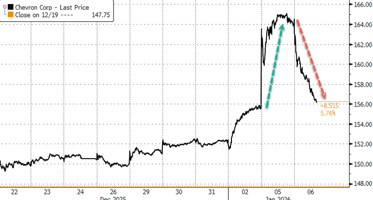On Monday, shares of Chevron, ConocoPhillips, and ExxonMobil jumped on news of regime change in Venezuela. However, Chevron shares had given up most of those gains by late trading on Tuesday.