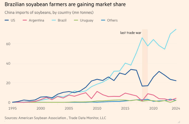 Financial Times noted, "For decades, more than half of all U.S. soybeans went to China, the world's biggest buyer. But this year, as trade talks between Washington and Beijing stall, not a single American soybean has headed east, leaving farmers struggling to stay afloat as bins fill and prices sag while China turns to record supplies from Brazil."
