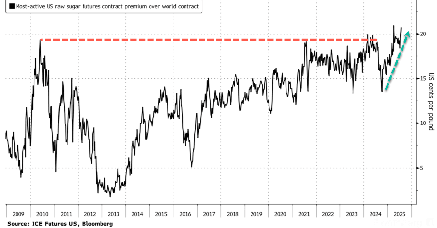 U.S. raw cane sugar futures are trading at record highs, with U.S. contracts now more than double the price of global benchmarks, widening the cost gap to an all-time record.