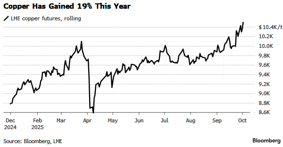 Copper futures on the London Metal Exchange rose above $10,500 a ton - the highest since May 2024 - driven by a mix of investing themes, macro tailwinds, and worsening supply outlook.