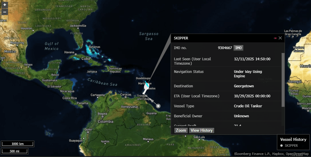 The incident comes amid heightened U.S. military presence in the region, and as Venezuela's crude exports dropped to 700 kbd in November. The Skipper has been repeatedly linked to sanction evasion tactics, including spoofing and mislabeled Iranian cargoes routed through Asia, raising alarms about ongoing maritime deception.