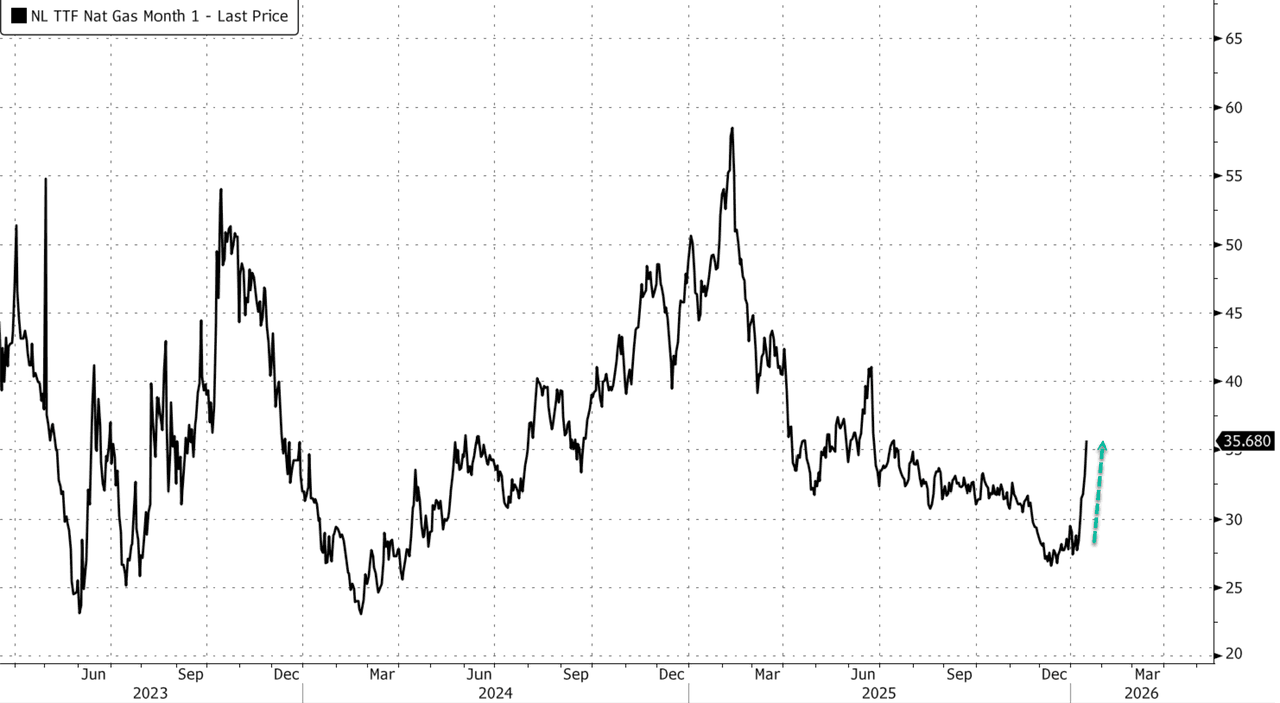 Dutch TTF natural gas futures, Europe's benchmark gas contract, are up 25% on the week and on track for their largest weekly gain since October 2023. The abrupt reversal in sentiment reflects tightening storage levels, short covering, and a burst of unusually cold weather sweeping across the continent.