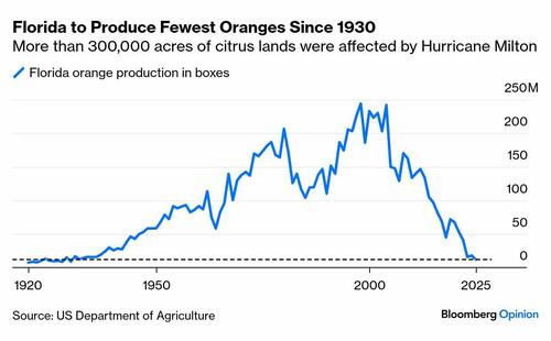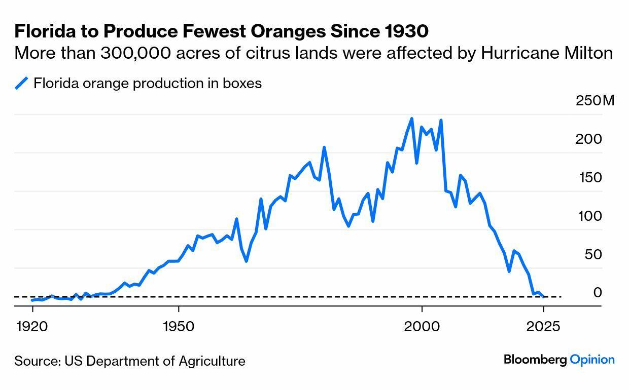 Even before the deep freeze, we have reported for years that the citrus industry in central Florida has been decimated by greening disease and tropical cyclones. The latest data from the USDA shows that this season's orange juice harvest will be the smallest since 1930.