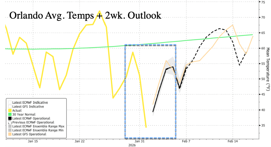 According to Bloomberg data, the average temperature in the Orlando metro area on Sunday was in the low 30s. The good news is that temperatures are expected to rise later in the week and, by mid-month, revert to 30-year seasonal norms around the mid-60s.