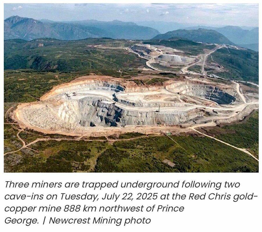 Three miners have been trapped 500 meters underground at Newmont Corp.'s Red Chris mine in northwest British Columbia since Tuesday after part of a non-producing area of the mine collapsed.