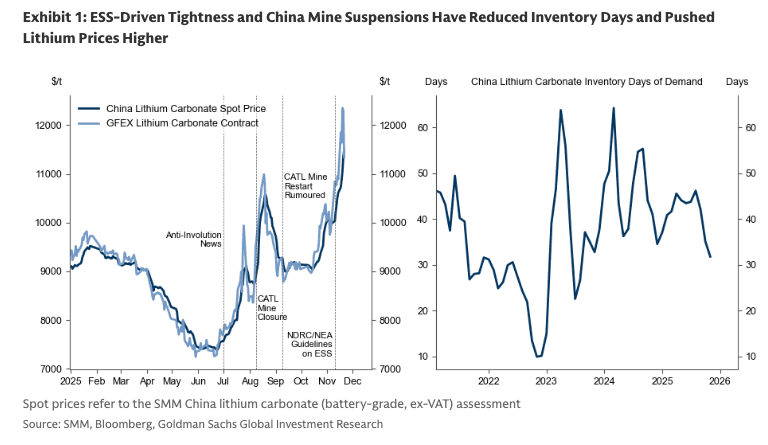 Lithium prices have awakened from a multi-year bust in the second half of this year, with Chinese lithium carbonate prices jumping from $6,000 a ton to $11,000 a ton, driven by what Goldman analysts describe as "temporary Chinese supply cuts" and "strong energy-storage-system (ESS) demand."