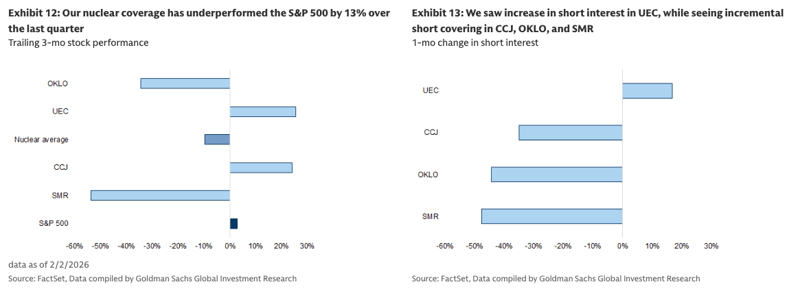 Nuclear stocks have seen mixed performance over the past three months, with our nuclear coverage averaging a -13% return over the period compared to the S&P which returned 3%. Performance was collectively positive across uranium-levered names (CCJ/UEC), likely in large part owing to the recent rally in spot uranium pricing, while SMR technology players have traded significantly off. With respect to investor positioning, UEC was the only stock in our coverage which saw an increase in short interest, as the stock continues to rally, up 26%/35% over the past 3mo/12mo. Across the remainder of our coverage, short interest decreased across both CCJ and OKLO while SMR saw the largest decrease in short interest.