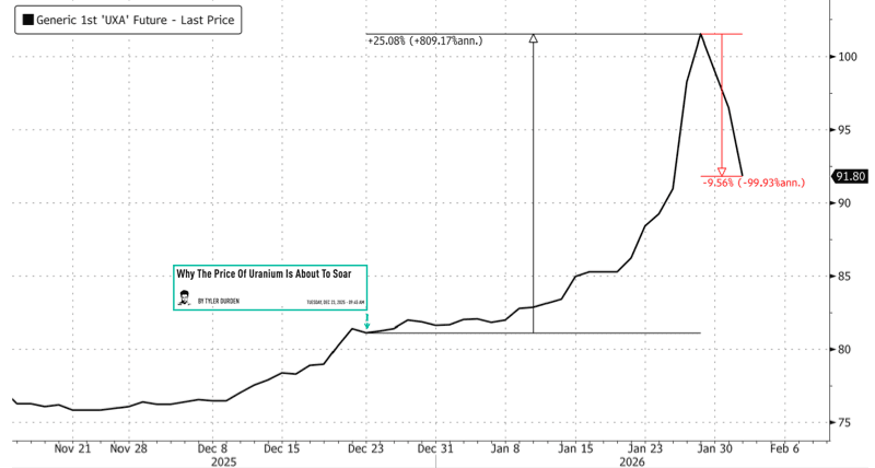 Our Dec. 23 note, "Why the Price of Uranium Is About to Soar," was published just days before uranium futures surged 25% to above $100 per pound. Prices have since corrected about 10% to around $91 per pound, but the broader thesis remains intact: up and to the right.