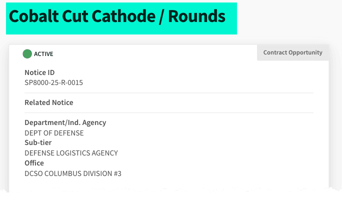 According to the System for Award Management (SAM) website, the Defense Logistics Agency (DLA) issued a solicitation to purchase cobalt cut cathode/rounds - sheets of cobalt metal designed for storage - to stockpile up to $500 million worth of the industrial metal (or about 7,500 tons), which is used in numerous defense applications ranging from jet engine turbines to armor-piercing munitions to high-strength permanent magnets in rockets.